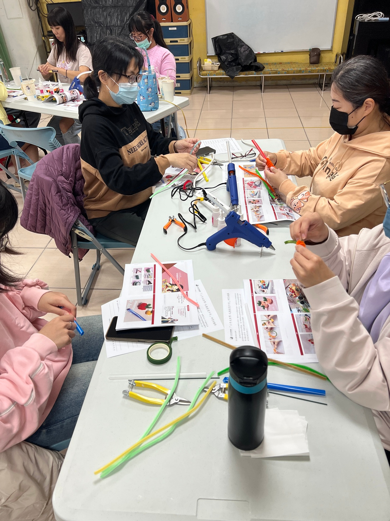 毛根具備柔軟、可塑性高與安全性佳等特性,非常適合應用於幼兒教學。本課程以「漢堡」與「糖葫蘆」為例,引導教師觀察:圓形的食材可視為「點」的延伸,毛根彎折形成「線」,而堆疊組合後則形成「面」。引導教師從孩子熟悉的元素出發,設計出具吸引力與參與感的教學活動。在實作過程中,教師不僅學習技法,更深入理解如何引導幼兒進行觀察、想像與創作。