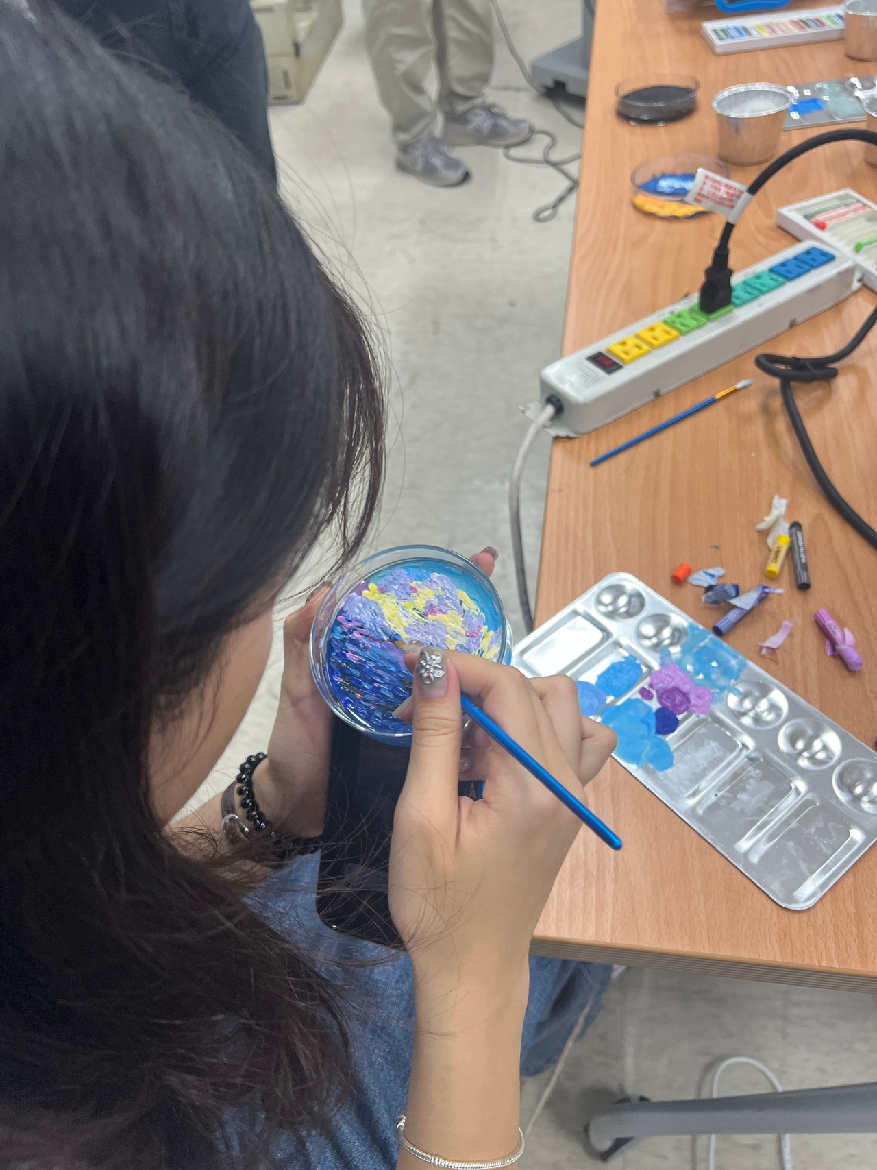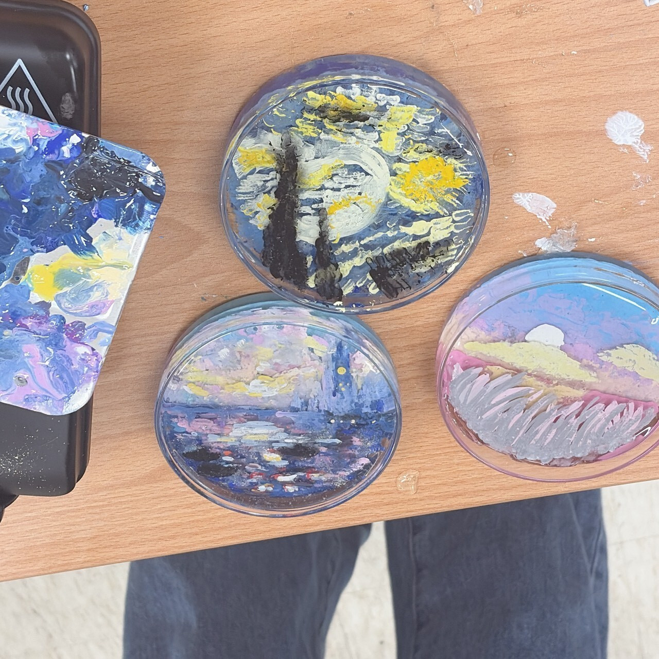 在實際創作中,學生從選色開始,逐步進入創作狀態。每一層顏色的堆疊,都像是在描繪內心的風景,隨著作品逐漸成形,也讓情緒有了出口。這樣的過程,不僅提升專注力,也讓身心逐漸放鬆。