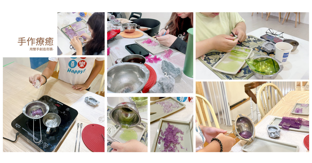 在實作過程中,透過分層堆疊與晶體塑形技法,學員將逐步建構出屬於自己的仿真礦石世界。課程不強調制式技術,而是鼓勵依照個人感受進行色彩與形態的自由表達,讓每一件作品都能呈現獨特的情緒語言。
